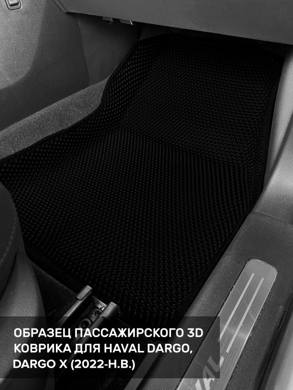 Автомобильные 3д коврики для Haval Dargo (2022-н.в.) в салон авто и багажник сделаны из инновационного полимерного материала EVA, изысканная структура в виде ячеек не дает воде, пыли и снегу разлетаться по салону машины и багажнику. 3д коврики зафиксированы на полу определенными клипсами, соответствующими Haval Dargo (2022-н.в.), и не двигаются в процессе езды.